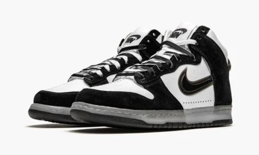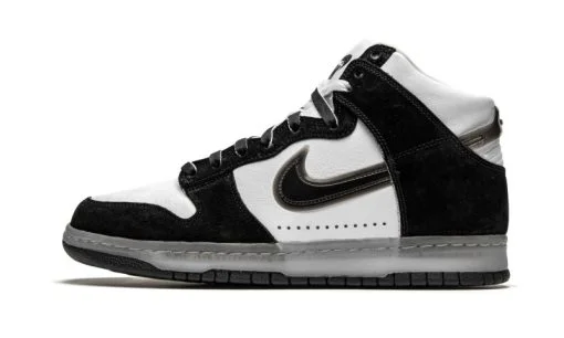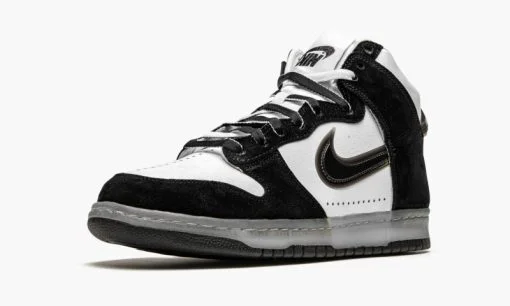 The Slam Jam x Nike Dunk High ‘Black/White’ is an October 2020 collaboration between the Italian sneaker boutique and Nike on the all-time classic high-top shoe. Inspired by Slam Jam’s rebellious attitude. the ‘Black/White’ colorway features an upside down Nike Air logo on the tongue tag that pretty much summarizes what this simple yet nuanced look is all about. Other details include crisp white leather on the toe. mid-panel. and collar. Contrasting black synthetic nubuck overlays can be found on the forefoot. eyelets. collar. and heel. Slam Jam and Nike continue the black and white theme on the rest of the shoe. opting for black and white shoelaces on top of the white tongue. A semi-translucent gum colored Swoosh appears on either side of the shoe. Underfoot. a clear midsole and solid black outsole finishes off the look. Release date: October 30. 2020.