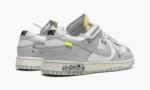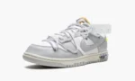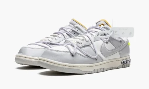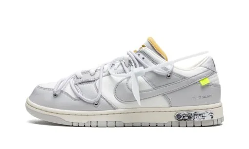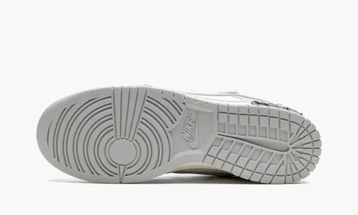 The Off-White x Nike Dunk Low ‘Lot 49’ is one of 50 colorways of the vintage basketball shoe designed by Virgil Abloh for the popular ‘Lot 50’ collaboration. From August 2021. Off-White and Nike’s ‘Lot 50’ series features 50 unique colorways of the classic low-top shoe. On ‘Lot 49.’ Sail canvas appears on the base. including on the perforated toe. mid-panel. collar. and heel. Neutral Grey leather panels and Swoosh branding contrasts the look. Black ‘Nike’ branding appears on the heel and Off-White’s signature Helvetica detailing is found on the medial side. A secondary. bungee cord-like lacing system appears on the upper. The look originated on the first Off-White x Nike Dunk collection from 2019. A traditional lacing setup can also be found on the shoe. On the midsole. a marbled black-and-white insert with ‘Lot 49 of 50’ branding completes the look. Release date: August 9. 2021