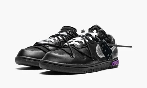 The Off-White x Nike Dunk Low ‘Lot 50’ is one of multiple colorways of Virgil Abloh and Nike’s impressive Dunk collaboration from 2021. The follow-up to Abloh and Nike’s ‘The 10’ collection from 2017. one of the greatest sneaker collaborations ever. the duo’s ‘Lot 50’ campaign finds 50 different arrangements of the vintage basketball shoe. each with unique materials and embellishments. On ‘Lot 50.’ the upper is constructed in a combination of black leather on the overlays and black canvas on the perforated toe and mid-panel. A Metallic Silver leather Swoosh appears on either side and silver ‘Nike’ branding is found on the heel. Abloh adds a secondary lacing system to the upper in addition to the traditional lacing setup. The bungee cord-like look was first seen on Off-White’s debut Nike Dunk collaboration from 2019. Signature Off-White Helvetica text is printed on the medial side. Underfoot. a black midsole with a purple marbled ‘Lot 50 of 50’ insert completes the look. Release date: August 2. 2021