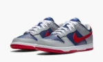 The Nike Dunk Low Retro ‘Samba’ is the remastered version of the former Japan-only colorway from 2001. This new global release of the ‘Samba’ Dunk in 2020 is part of Nike’s strategy of bringing back once-rare Dunk colorways from its Co.Jp initiative. The modern reissue of the ‘Samba’ features the same interesting color block as the ‘OG.’ as navy blue leather can be found on the perforated leather toe. mid-panel. and collar. Silver leather overlays on the forefoot. collar. and heel bring a stark contrast to the appearance of this low-top shoe. Samba Red leather Swoosh hits appear on either side and black ‘Nike’ embroidery sits atop the red heel tab. Additional design elements include white cotton laces. a blue nylon tongue. and white ‘Nike’ detailing on the navy nylon tongue tab. Release date: August 21. 2020.