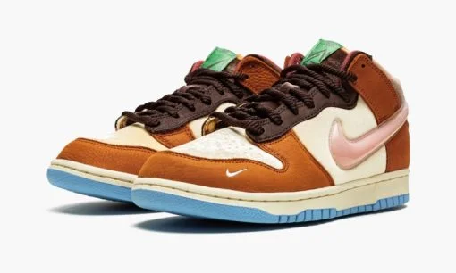 The Social Status x Nike Dunk Low ‘Chocolate Milk’ is a limited edition collaboration between the upscale sneaker and streetwear shop and Nike on the retro basketball shoe from the collective’s ‘Free Lunch’ series. The ‘Chocolate Milk’ is one of several creative Dunk colorways by Social Status that is inspired by federally assisted public school meal programs for kids. The ‘Chocolate Milk.’ as its name suggests. is dedicated to the delicious beverage. Yellow velour appears on the base of the shoe. The overlays are constructed from brown leather and a pink TPU gel Swoosh appears on either side. A list of the shoe’s ‘ingredients’ is printed on the medial side of the shoe while the expiration date appears on the inner collar. A cream-colored midsole and blue rubber outsole complete the look. Release date: September 10. 2021