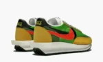 The sacai x Nike LDWaffle Trainer ‘Green Gusto/Varsity Maize’ is one of two colorways released of the unique collaboration. Japanese avant-garde fashion label sacai brings its distinct aesthetic to this retro-meets-future silhouette that is a hybrid combination of two vintage Nike running models. the LDV and Waffle Racer. The construction essentially layers the uppers of each model on top of each other. with two layers of suede and double Swooshes atop the mesh base. The foam midsole follows the same concept. stacking two sole units on top of one another. Double tongues and double laces complete the theme. This colorway combines a lime green/black Waffle Racer with the a maize/orange LDV. The limited edition sacai x Nike LDWaffle Trainer ‘Green Gusto/Varsity Maize’ released in early 2019.