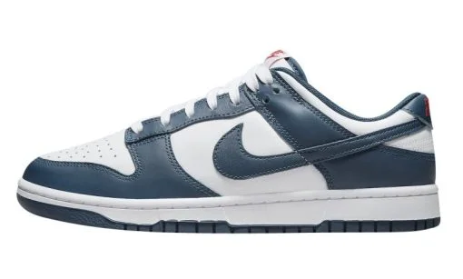 The Nike Dunk Low Valerian Blue arrives in a smooth white leather construction with deep Valerian Blue overlays and Swooshes. Hits of red on the woven tongue label and heel embroidery add a subtle contrast. At the base. a matching white and blue Air sole completes the design.