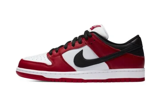 The Nike SB Dunk Low ‘Chicago’ is dedicated to the styling and color block used on the original Air Jordan 1 of the same nickname from 1985. A tribute to Michael Jordan’s all-time classic signature shoe. this ‘Chicago’ Dunk is almost a spitting image of the Jordan 1 Low. The two distinctly retro silhouettes are a product of Nike’s mid-80s performance basketball footwear campaign. The skate-adjacent Dunk features a white leather perforated toe with white leather mid-panel walls. Fiery red leather overlays dot the forefoot. eyelets. and heel. Branding appears in the form of a black leather Swoosh on either side of the shoe. tonal ‘Nike’ embroidery on the heel. and white accenting Nike SB detailing on the red nylon tongue tag. Given that this is the skateable version of the Dunk. the shoe displays a puffy white mesh tongue for impact absorption. Finishing touches include black cotton laces and a two-toned white midsole and red outsole. Release date: Fall 2020.