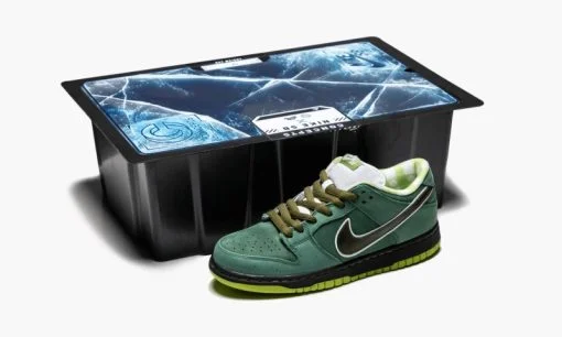 The Concepts x Nike SB Dunk Low ‘Green Lobster’ was an extremely limited edition version of the 2018 Lobster Dunks from Boston sneaker boutique Concepts. While the Purple Lobster Dunk combined Concepts’ previous red and blue colorways. the Green Lobster edition was a mashup of its blue and yellow Nike SB Dunks. The shoe is constructed with a combination of nubuck and leather on the upper in varying shades of green. The picnic blanket-themed lining is done in a green and white checkerboard pattern. and a black midsole contrasts nicely with the bright green outsole. The Concepts x Nike SB Dunk Low ‘Green Lobster’ released in extremely limited quantities in December 2018 with this special edition box.
