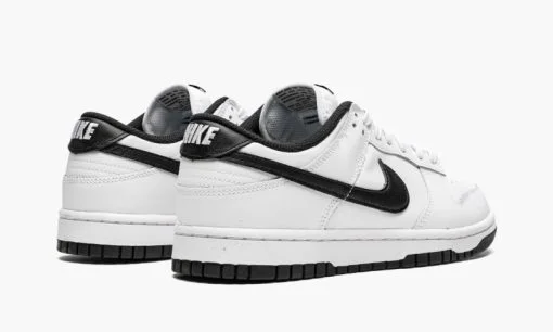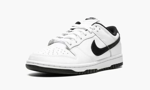 The Women’s Nike Dunk Low ‘White/Black’ is a two-tone. white-and-black colorway of the vintage basketball shoe in women’s sizing that excels in versatility. The ‘White/Black’ was released in February 2022 and features the Dunk’s classic ‘Black/White’ or ‘Panda’ color scheme in an interesting new arrangement. The shoe’s upper is constructed in white leather. including the perforated toe. overlay panels. collar. and heel. A black leather Swoosh is found on both sides. On the heel. a black leather tab with white ‘Nike’ and Swoosh branding balances out the shoe’s mostly monochromatic white appearance. A black ‘Nike’ logo is paired with a black Swoosh on the tongue tag. White laces are layered over a white tongue. Release date: February 2. 2022